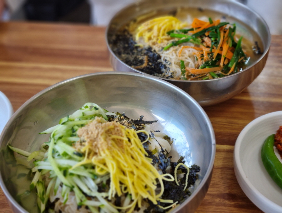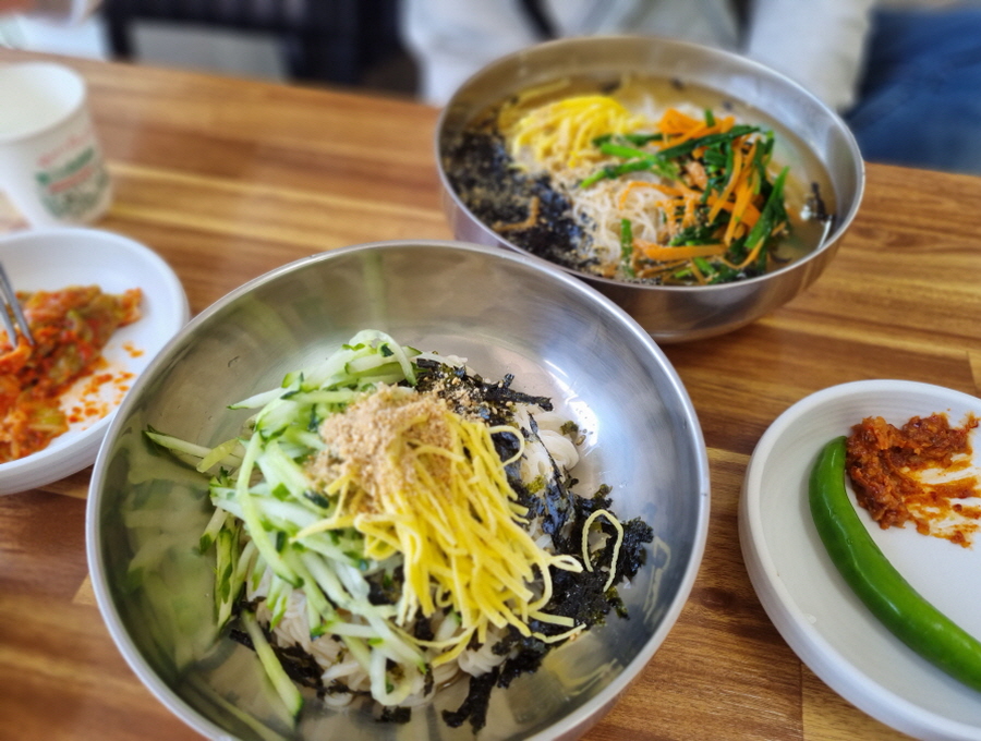 저는 비빔국수를, 남편은 잔치국수를 시켰어요. 1인 1주문은 필수이고, 물과 반찬은 셀프로 가져오면 됩니다. 주문하니까 사장님께서 어떤 메뉴가 남자분 꺼냐고 여쭤 보시더라고요. 아마 양을 좀 더 주시려고 그러시는 듯 한데, 저도 참 잘 먹거든요 사장님 ㅠ_ㅠ...