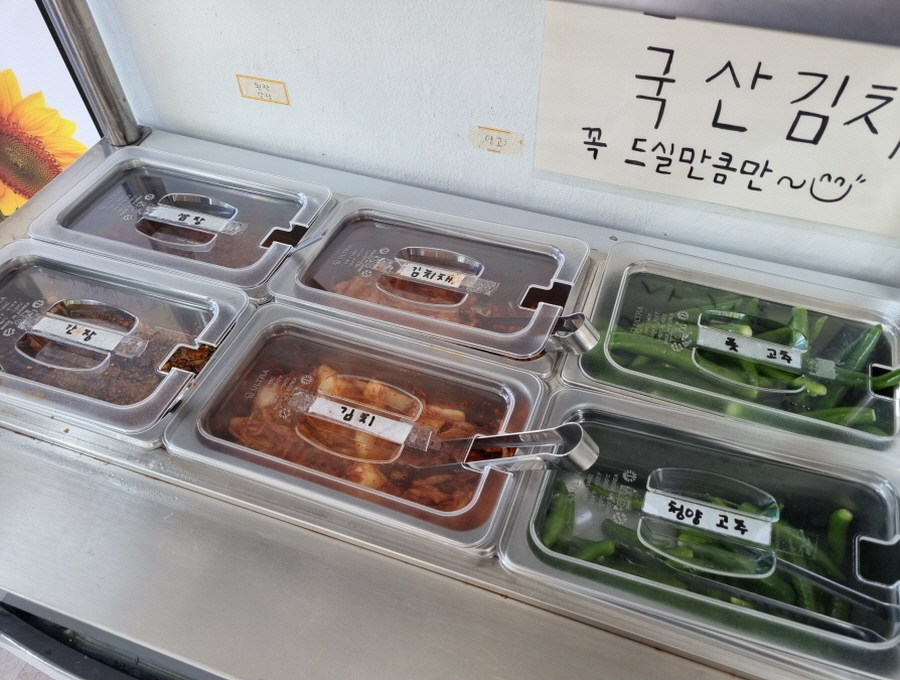 셀프 코너에 있는 반찬입니다. 쌈장, 간장, 김치채, 김치, 풋고추, 청양고추까지 깔끔하게 담아 놓으셨어요. 김치는 국산이니까 맘 놓고 드셔도 됩니다 ㅎㅎ 국수에 빠지면 섭섭한 김치채까지 준비되어 있으니까 편하게 가져다 먹으면 돼요.