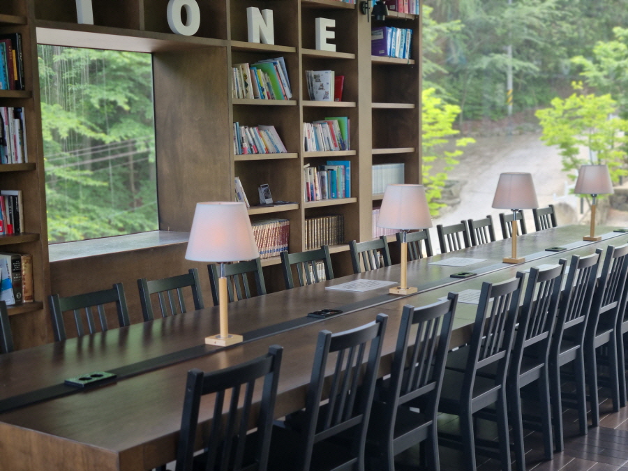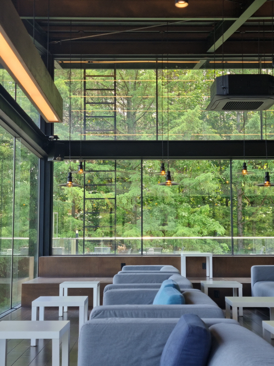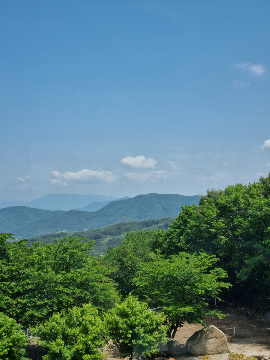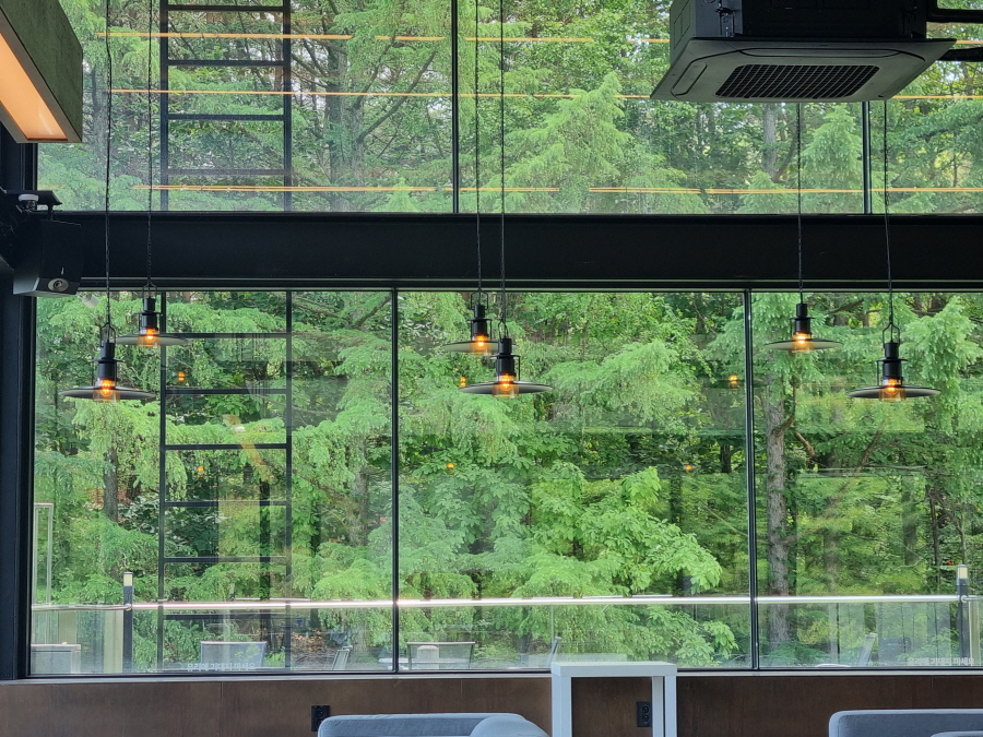 푸릇푸릇한 통창 너머의 풍경을 보고 있으면 근심 걱정이 싹 사라지는 느낌! 1층이지만 지상과는 살짝 떨어져 있기 때문에 요렇게 조망할 수 있어요. 여름이 오고 있는 팔공산 -