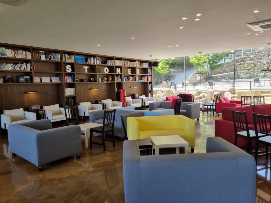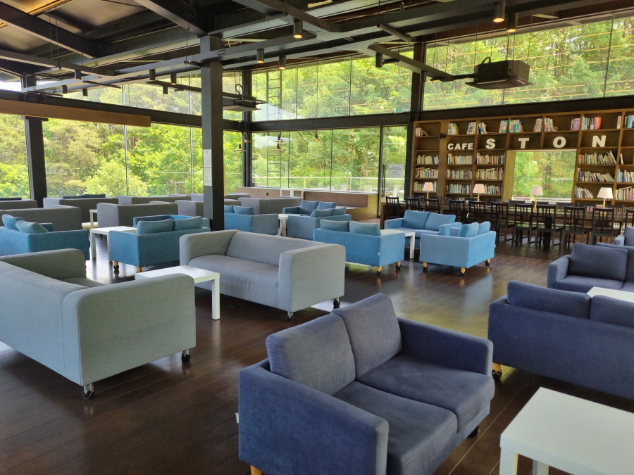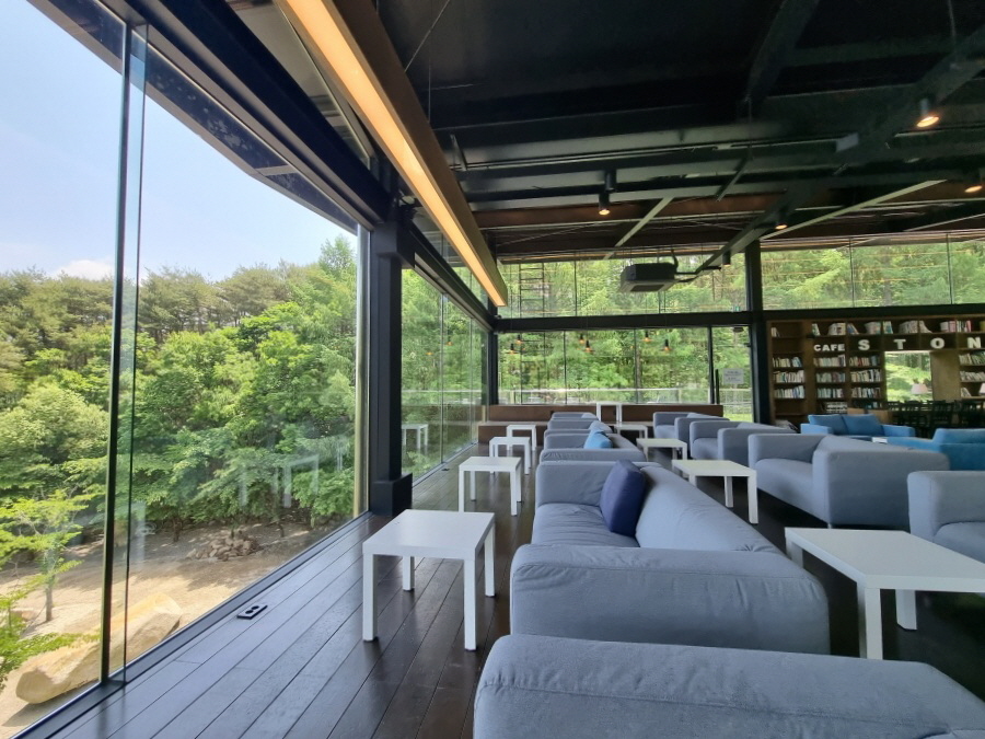 팔공산 군위 카페스톤은 1층 뷰도 이렇게나 멋집니다. 엄청 넓어서 소파도 테이블도 부족함 없이 배치되어 있고, 가족들이 놀러오기 딱 좋은 사이즈에요.