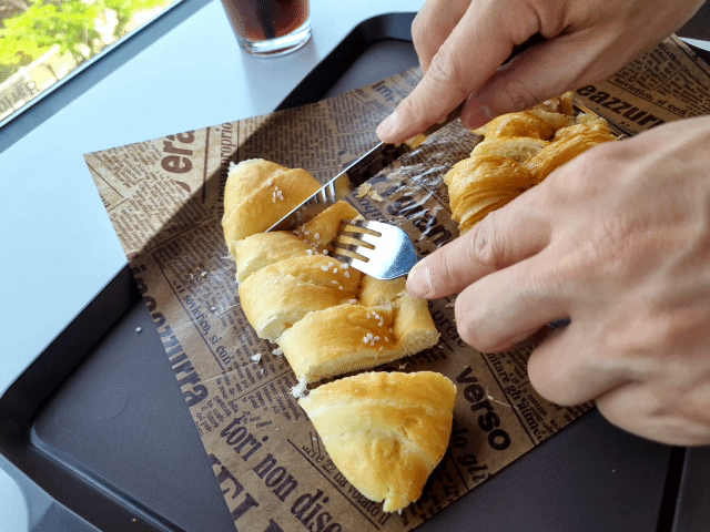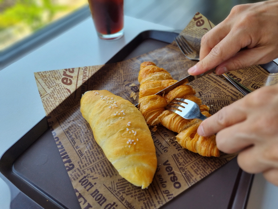 오픈 시간에 맞춰서 갔더니 아직 디저트는 많이 나와 있지 않았어요. 선택의 폭이 좁긴 했지만 소금빵과 크로와상을 하나씩 집어 들었습니다.